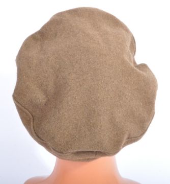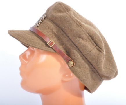 A replica WWI First World War Manchester Regiment ' Tommy ' trench cap. Khaki wool construction with stitched peak, narrow brown leather chin strap and Manchester regiment cap badge.
