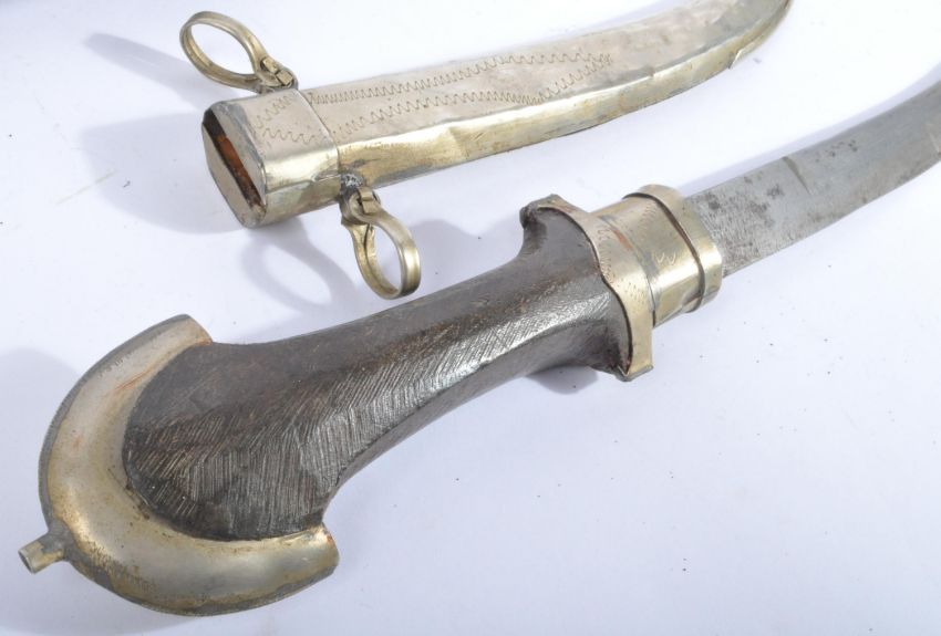 Two early 20th Century African ( Moroccan ) Jambiya / Jambya daggers. Dome shaped pommels with wooden handles and metal furniture mounts. The curved blades housed in finely decorated metal scabbards. Each to measure approx 40cm.