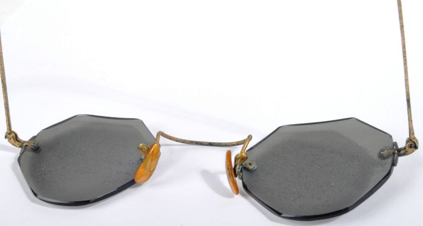 Mahatma Gandhi (1869-1948) - a pair of c1910 German made sun glasses / sunglasses, once owned and worn by Mahatma Gandhi. Delicate gold plated arms, with frameless octagonal 'tear drop' shaped lenses, Bakelite nose rests, and black-dipped ear supports. Housed within their original lined case, with original label to interior, which bears a hand inscription in ink 'To Mr Shankaran, From Mrs Gandhi '. Both arms engraved 'Made In Germany.' The spectacles remain in good structural condition, but the gold plating has worn away in places, and the rubberised arm-ends have deteriorated. It is possible that the glasses are made frameless, so that they may be slipped over a normal pair of spectacles (Gandhi's iconic glasses). A unique and historically important lot.