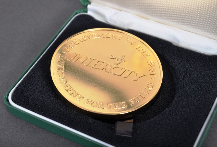 Railwayana - a Limited Edition Royal Mint bronze gilt medallion commemorating 150 years of the Intercity railway line from London to Bristol. The large medallion depicting an Intercity locomotive to the front  with London - Bristol and the dates 1841 - 1991 to the perimeter. The reverse reading ' Achievement In The Past. Investment For The Future '. Housed in the original green presentation case with certificate. Medallion measures approx 6cm.