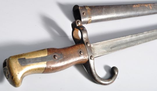 A 19th Century 1874 pattern French Gras Rifle Epee sword bayonet. Brass hooked pommel with push release button and wooden grip. Muzzle ring and forward facing quillon, marked to the crossguard 14517. The T section blade engraved to the spine with French scroll and dated 1877. Housed in a steel scabbard. Measures approx 66cm.