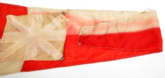WWII Second World War Interest - a 20th century large ship's Royal Navy related pennant / signal flag. Linen construction, the seam marked with maker's marks for Thomas Briggs and further stamped ' 547 '. Red and white, with an additional (faded) Union Flag stitched to the centre. Measures approx; 66cm x 230cm. History unknown.