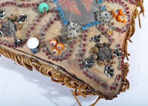 A WWI First World War sweetheart's cushion. Profusely decorated with various beads, and featuring a central silk ' With Best Wishes ' union flag panel. Heart shaped, with braidwork to the lugs. Measures approx; 19cm wide.