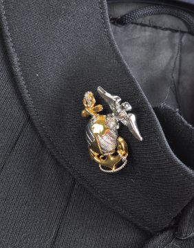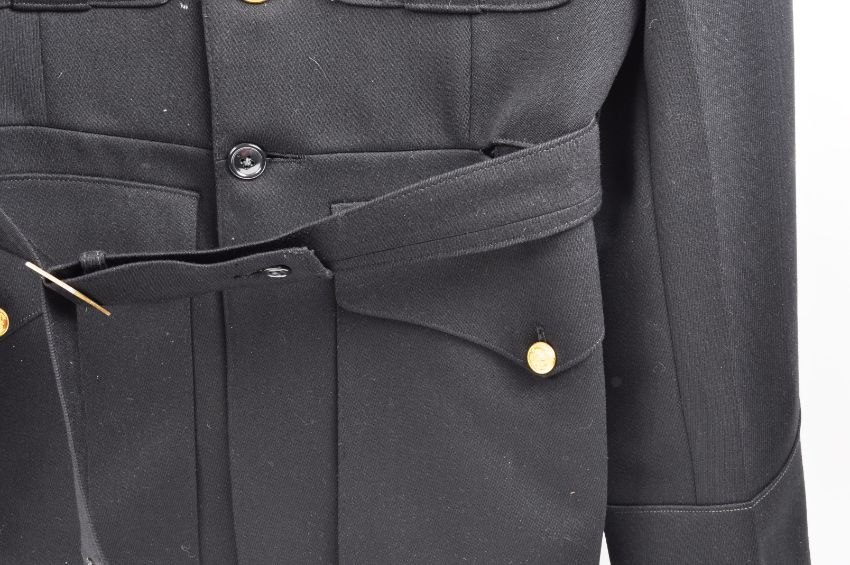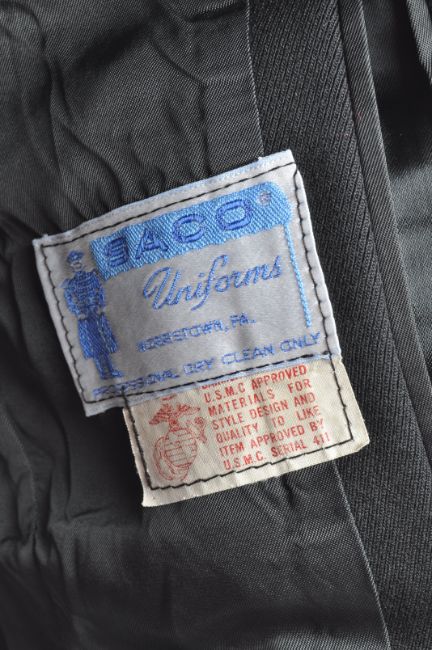 An original 20th Century US United States Marine Corps (USMC) Major Officers uniform dress tunic. The dark blue jacket with standing collar having the gilt oak leaf badge to each shoulder for rank of Major. Three bars of medal ribbons with bronze star and combat ' V ' to the left chest.