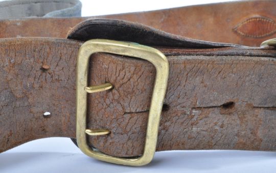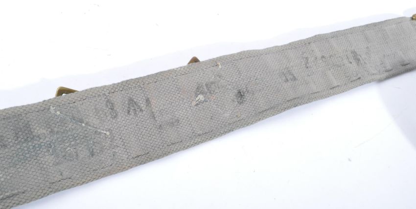 An original WWII Second World War British RAF Royal Air Force Officer's uniform blue webbing belt with brass fittings and broad arrow inspection marks along with a British Sam Browne leather belt.