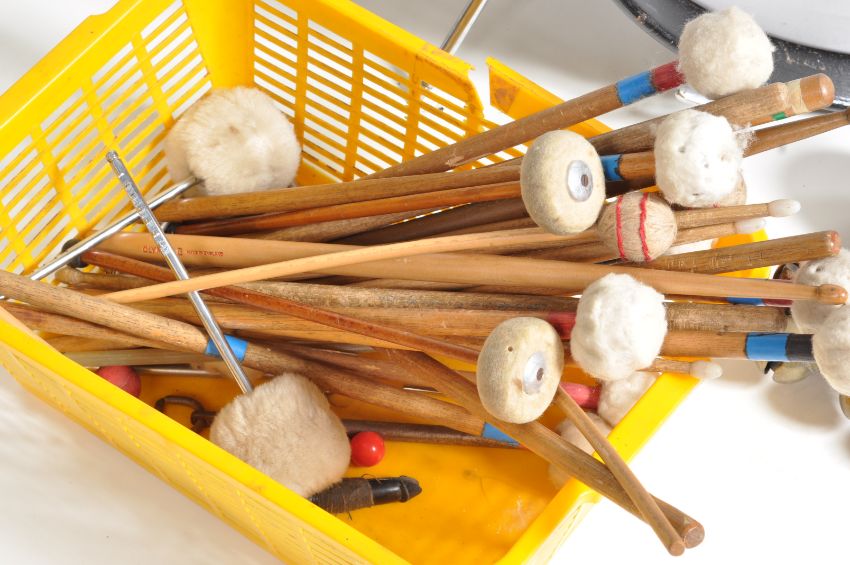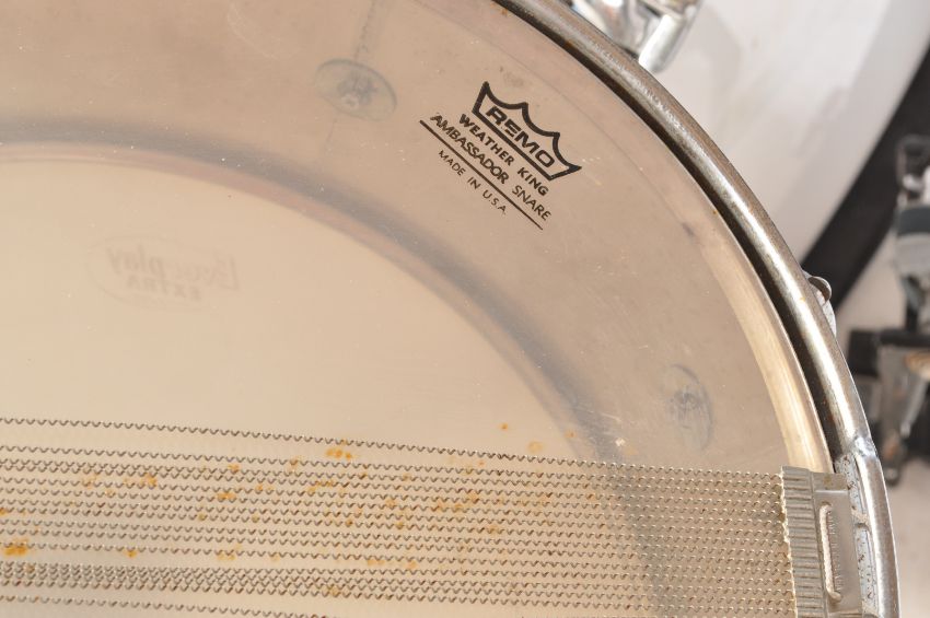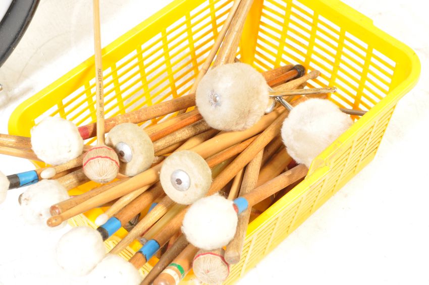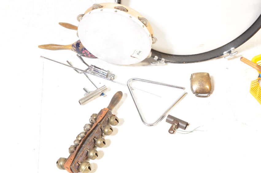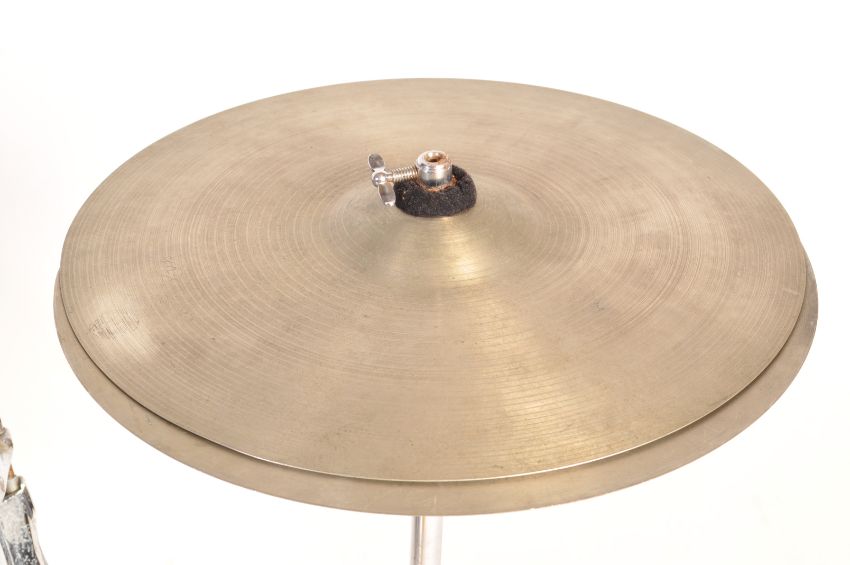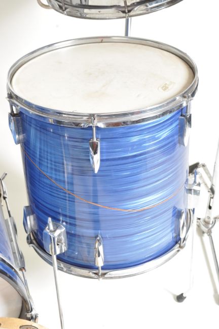 A mid 20th century circa 1960's Premier drum kit having a hi hat, kick drum, tom, floor tom, seat, drumsticks, percussion instruments and more. Owner was in a RAF band during the late.