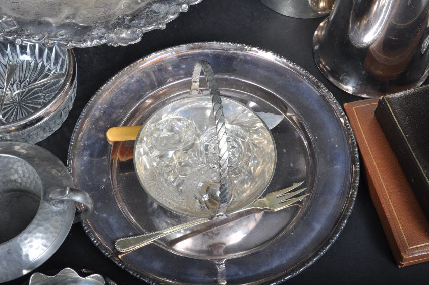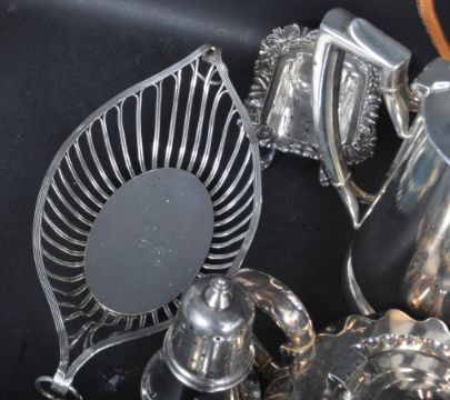 A large collection of vintage retro 20th century silver plated ware to include cutlery, sugar shaker, centre piece, teapot, hot water pots, condiments pots, teaspoons, forks and many more.