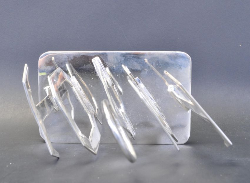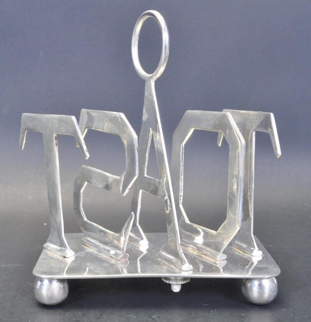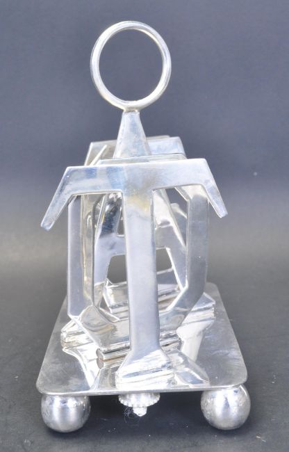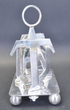 A vintage style silver plated toast rack having a carry handle to the top, dividers spelling toast raised on bun feet. Good condition. Measures 14cm x 13cm x 7cm.