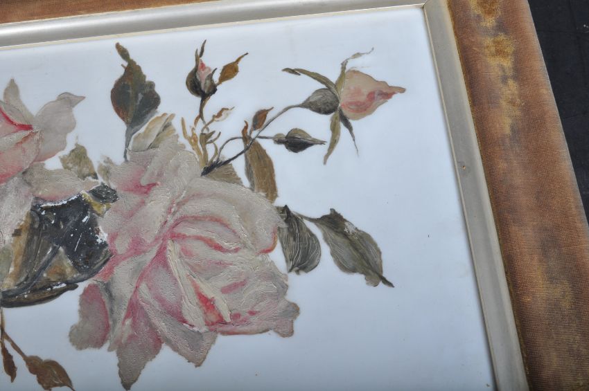 An early 20th century Edwardian painted milk glass having a white background with polychrome floral decoration set within a green fabric border. Measures 63 cm x 38 cm.