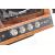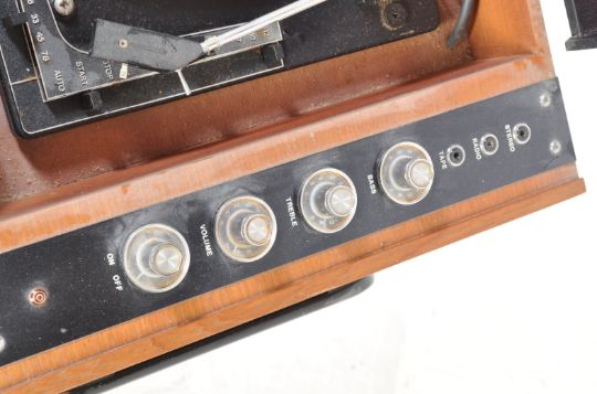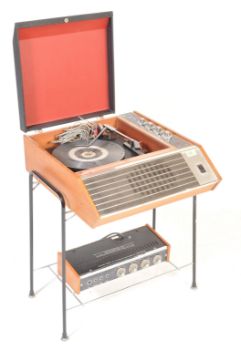 A vintage retro mid 20th century Ultra record player and amplifier. The record player having a BSR deck fitted in a teak wood case with black vinyl hinged lid, chrome turn control buttons to the side and spikes at the front complete with original metal wire stand and a matching amp.