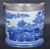A Victorian revival Chinese style blue and white ceramic biscuit barrel with silver plated mounts. The biscuit barrel having a carry handle to the top, finial to the lid, countryside scenes to the barrel and raised on a circular base. Makers stamp to the underside. Measures 23cm tall.