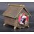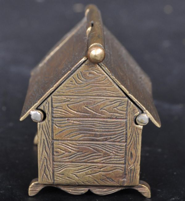 A vintage style brass cased shaped vesta case with enamel plaque of a pug dog in the form of a kennel, having hinged lids, wood like decoration to the body and curved legs. Measures: 5cm x 5cm x 4cm.
