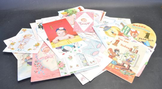 A collection of vintage mid 20th century birthday cards and 1930's cigarette cards. The collection comprising of vast variety of colourful birthday cards decorated with animals, cartoon characters and babies. The cigarette cards collection includes W.D. & H.O. Wills - Garden Flowers - Roses - Old Inns - English Period Costumes, and many more. Condition: good used condition.