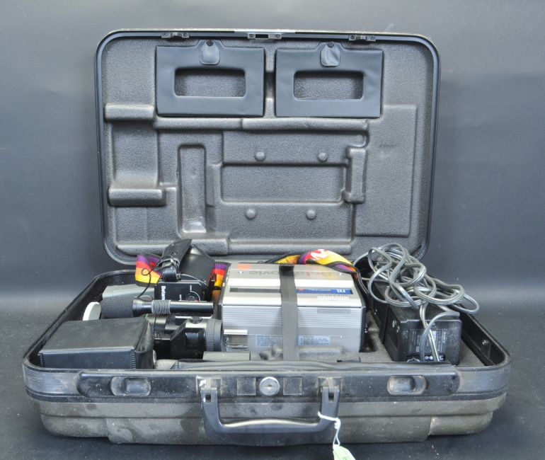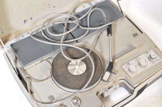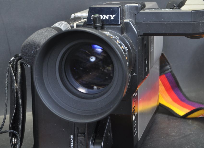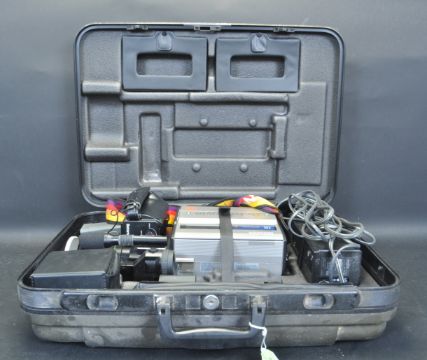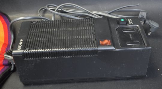 A collection of vintage retro audio and video equipment. The collection comprising of a Sony Betamovie video recording camera in original case, Grundig C 100 L cassette player, portable record player and a Sanyo G3001 3 in1 hi-if audio musical system comprising of a record player, cassette player and radio tuner.