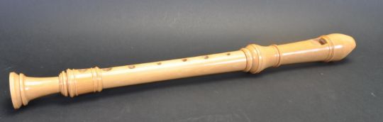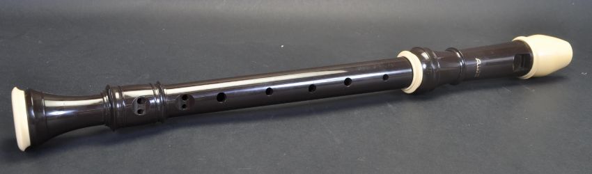 A group of three vintage retro 20th century Aulos recorders / flute. The collection comprising of a three pieces maple recorded in original presentation box and two three pieces brown plastic recorders. Measures 47 cm long.