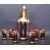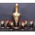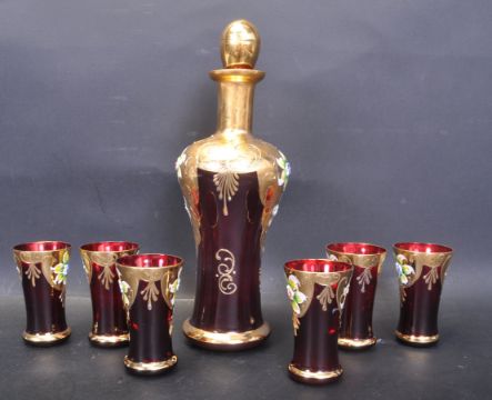 A vintage retro mid 20th century Murano Glass Tre Fuochi decanter and six glasses. The decanter having gold leaf to the top half with embossed enamel floral decoration red glass bottom half complete with stopper and six matching glasses. Measures 29 cm tall.