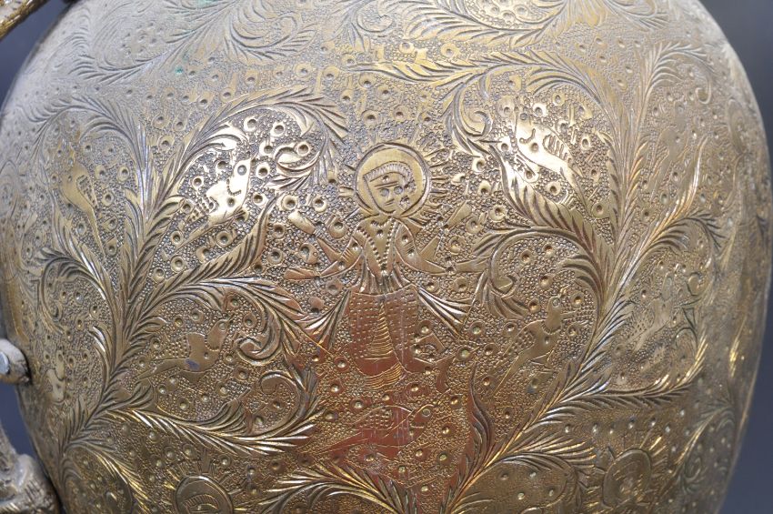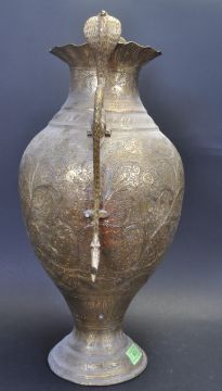 A vintage 20th century Indian brass vase having a twin serpent handles with foliate decoration raised on a circular base. Measures 48 cm tall.
