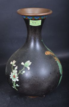 A vintage 20th century Chinese Oriental lidded vase having a gold finial with polychrome decoration. Together with a vintage 20th century Cloisonné vase having a black background with polychrome floral decoration throughout. Largest measures 32cm. Signs of wear and tear commensurate with its age.