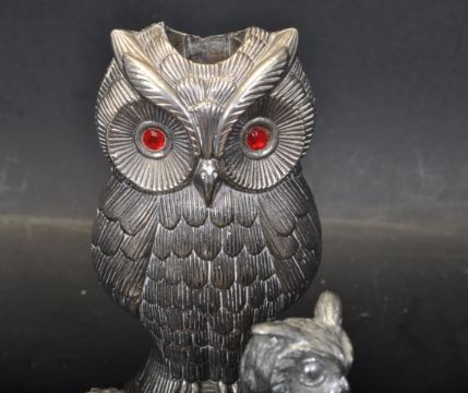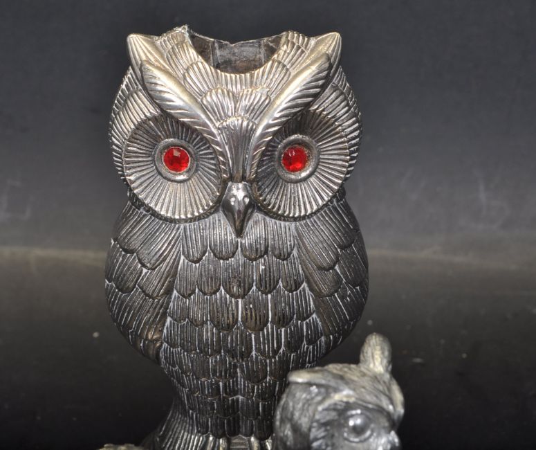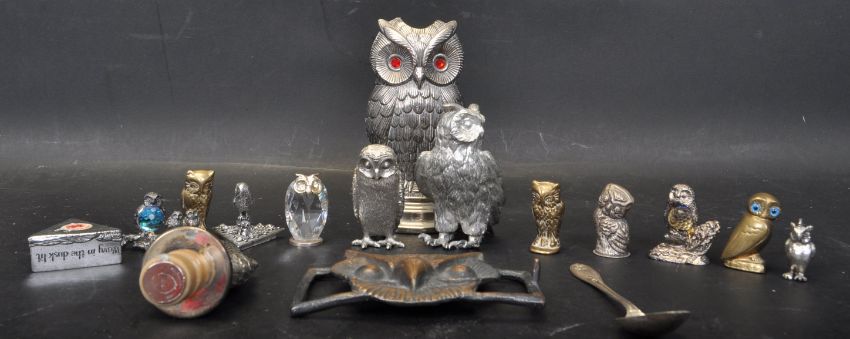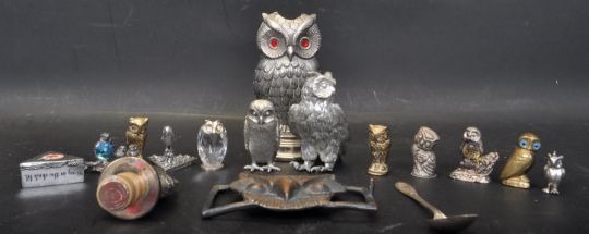A large collection of early 20th century and later owl ornaments comprising of a brass owl buckle, white metal owl ornament with red eyes, owl spoon, owl bottle stopper. and more.