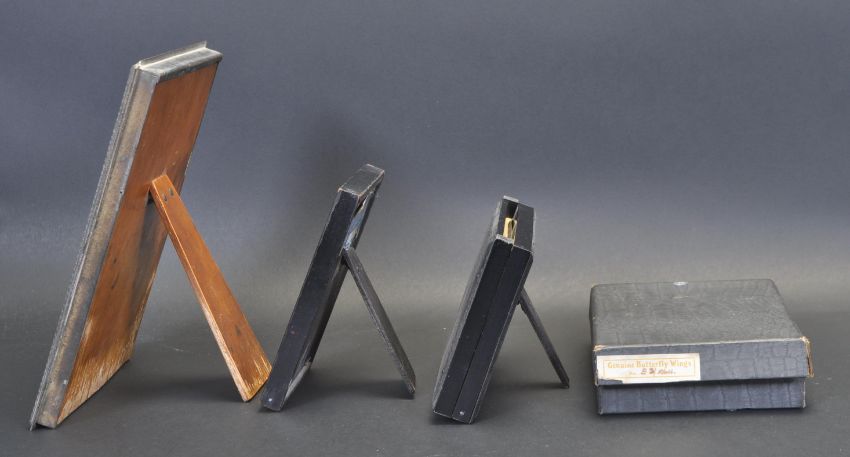 An Art Deco circa 1930s Butterfly wing items comprising of an original butterfly wing desktop calendar having polychrome decoration of a woman with surrounded by children and doves. Comes in original box Calendar is dated 1931. Together with a butterfly wings picture of a clown and a Middle Eastern scene. Measures 22 cm x 17 cm largest.