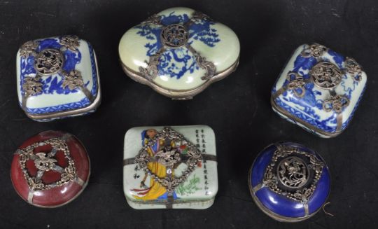 A collection of six vintage 20th century Chinese Oriental ceramic trinket pots all having metal detailing with polychrome decoration. Largest measures 12cm.