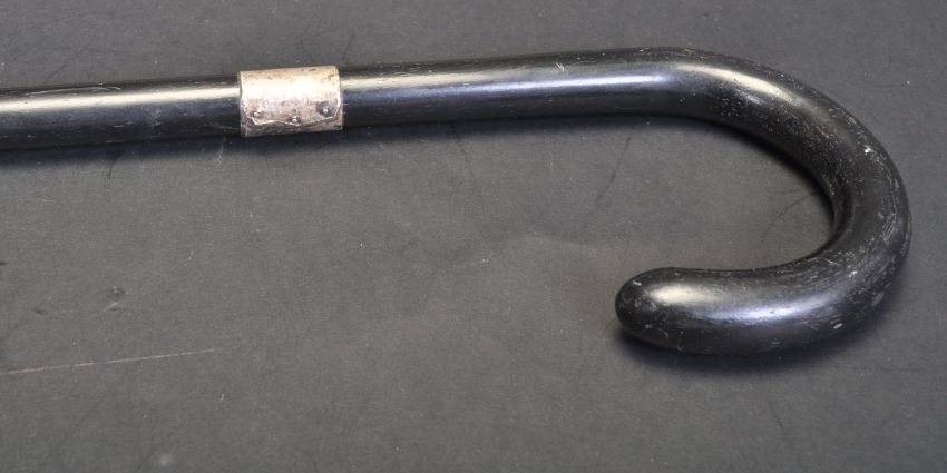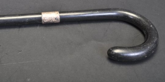An early 20th century ebonised wood walking stick / cane having a hallmarked silver collar. Hallmarks read Birmingham, 1926. Makers mark illegible. Measures 92 cm long.