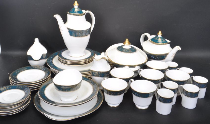 A large collection of Royal Doulton Carlyle pattern china dinner / tea service comprising of coffee pot, tureen, plates and more. Makers mark to the underside. Model H5018. The tea service has gilt decoration with floral detailing to the edges.