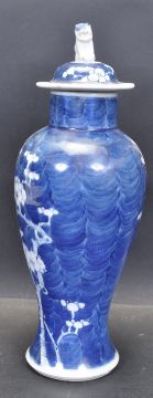 A 19th century Chinese oriental ceramic porcelain prunus blossom ginger jar with Foo Dog lid. The blue and white ginger jar having a Foo Dog finial to the lid with prunus decoration raised on a circular foot having twin blue circle marks to the underside. Measures 32 cm tall.