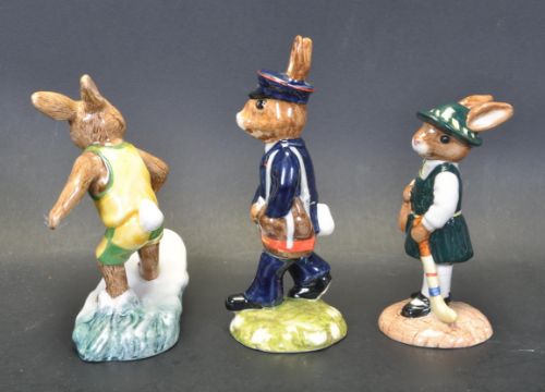 A set of three vintage late 20th century Royal Doulton ceramic figurines. Comprising of: Postman DB76, School days DB57 and Aussie surfer DB133. All having polychrome decoration. Makers stamp to the underside. All in original boxing. Measures 11cm tall. No visible damage or repairs.