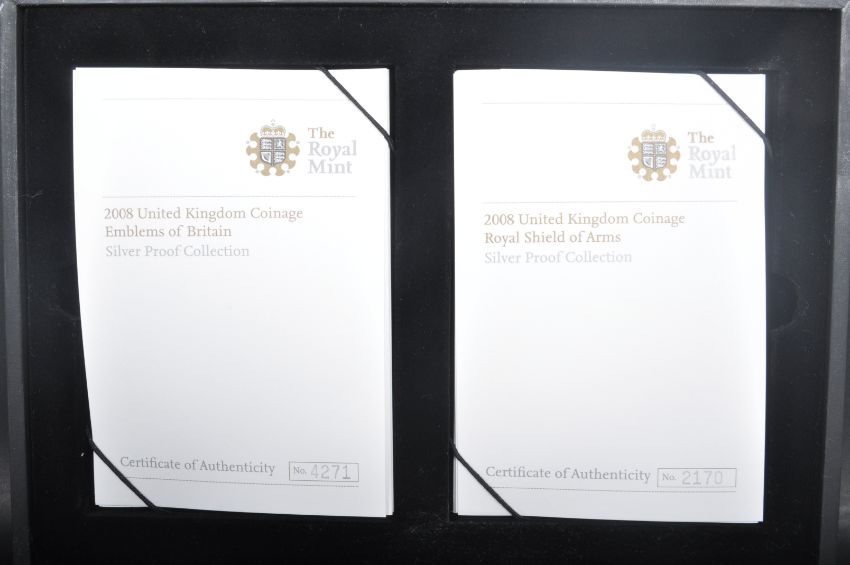 A 2008 United Kingdom Coinage Emblems of Britain Silver Proof Collection together with a 2008 United Kingdom Coinage Royal Shield of Arms Silver Proof Collection. Boxed with certificates of authenticity.