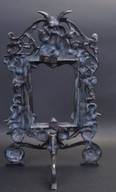 A mid 20th century cast iron easel photo frame having pierced decoration with foliate motifs and cherub.