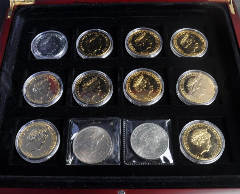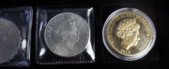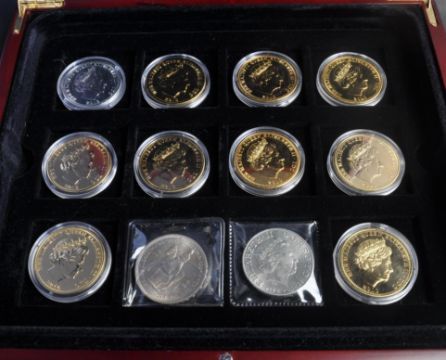 A large collection of United Kingdom and International 20th century and later currency. Collection includes First World War 24ct gold plated proof centenary crowns, large gold plate Head of the House of Windsor coin, 2013 silver proof £5 coin, 2010 Three Kings crown, VE day One Crown, Birth of a Princess gold crown, Douglas Bader one crown, Queen Victoria one Crown, 5 x £1 notes, Weimar republic German Marks and more.