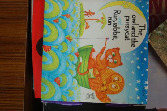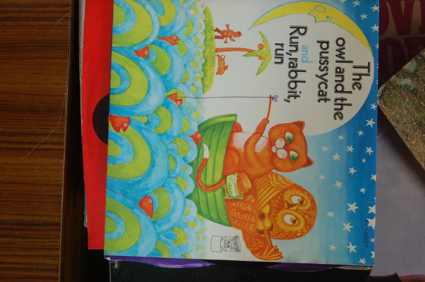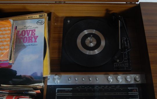 A retro vintage 20th century teak cased HMV stereogram having a record turntable together with a VHF radio raised on quadrille style supports. Comes together with a selection of vinyl