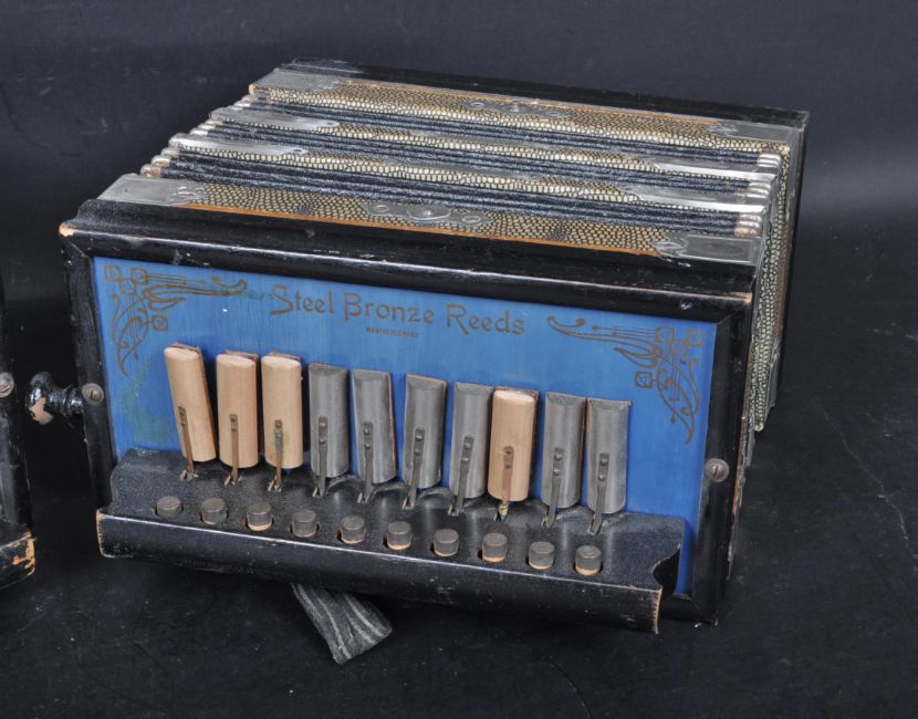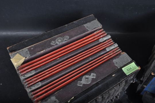 Two vintage 20th century accordions comprising of a Monogram Fabrik Marke decorated in a red colourway having hand straps to the sides. Makers stamp to the corner. Together with another.
