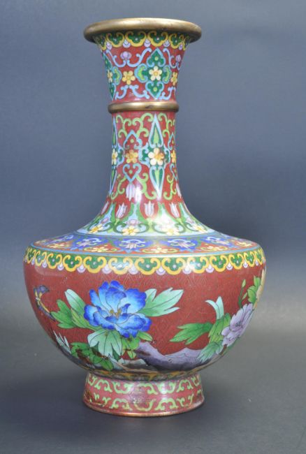 A mid 20th century cloisonné vase having a flared lip with a compressed baluster form raised on a circular base. Measures 27cm high.
