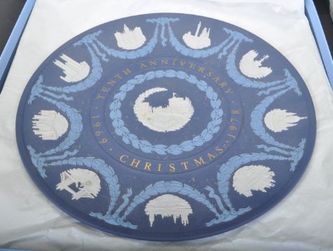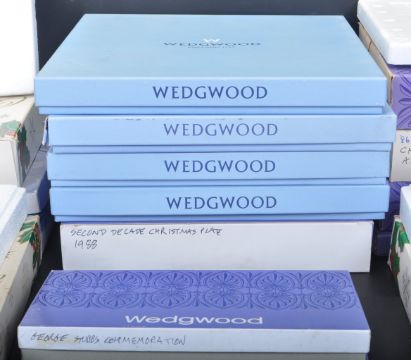 A large collection of vintage 20th century Wedgwood Jasperware commemorative plates comprising of George Stubbs commemoration, 1969 commemorative plate x 2, Christmas 1987, Christmas 1984, Christmas 1975, Christmas 1982, Christmas 1986, Christmas Decade Plate 1979 - 1988, Christmas 1981 Green on White plate, Christmas Decade Plate 1969 - 1978, Christmas Decade Plate 1978 - 1989. All boxed.