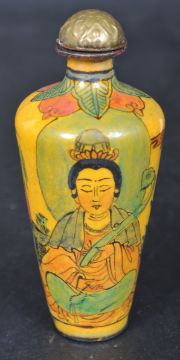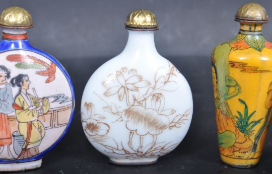 A group of four 20th century Chinese oriental snuff / opium bottles. Three enamel bottles decorated with floral motifs and people motifs along with another bone snuff bottle decorated with people scenes.