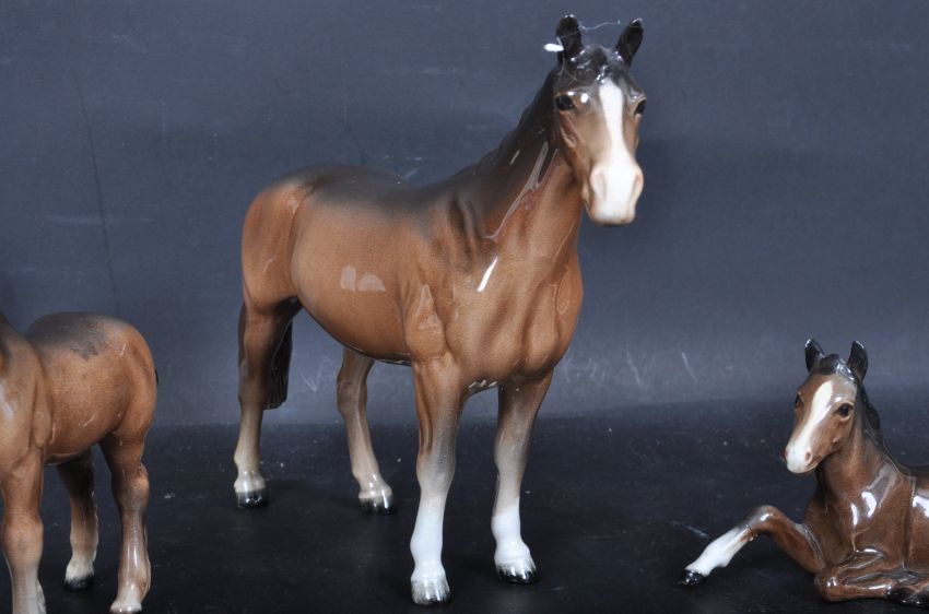 A collection of three vintage 20th century Beswick ceramic horses having polychrome decoration throughout. Collection comprises of a mare with two foals. Makers stamp to the underside. A/F. Measures 18 cm.