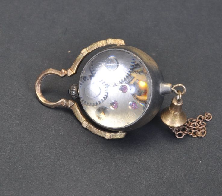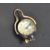 A vintage style brass cased bulls eye desk clock. Stamped Switzerland made 1882 to the clock face. Having roman numerals to the chapter ring, swing mount handle and bell below. Measures 8cm long.