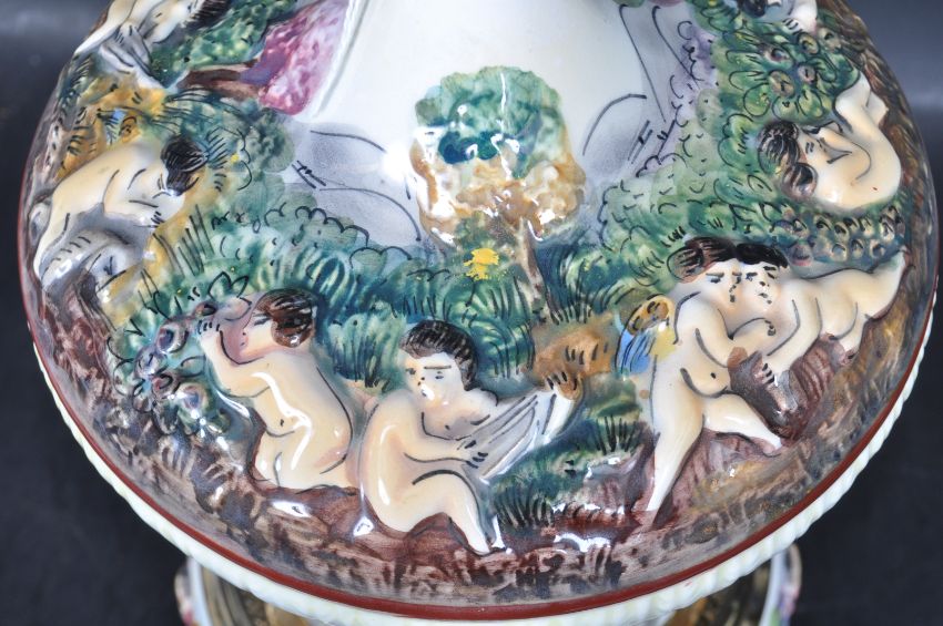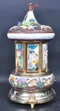 Capodimonte - A vintage late 20th century porcelain and brass musical carousel cigarette dispenser having a putti finial with polychrome decoration throughout raised on acanthus leaf feet. The dispenser plays Fascination / The Emperor Waltz and has a swiss musical movement within. Measures 35 cm tall.
