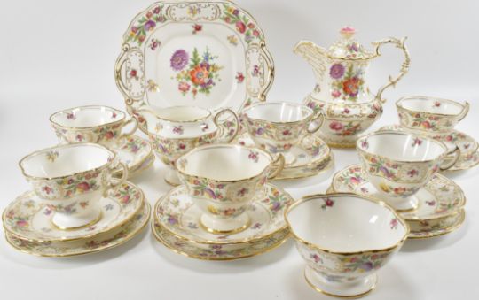 A vintage 20th century ceramic tea service by Hammersley in the Dresden Sprays pattern. The tea service has polychrome floral decoration with gilt edging. Makers stamp to the underside. Service comprises of cups, saucers, teapot and more.