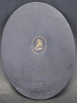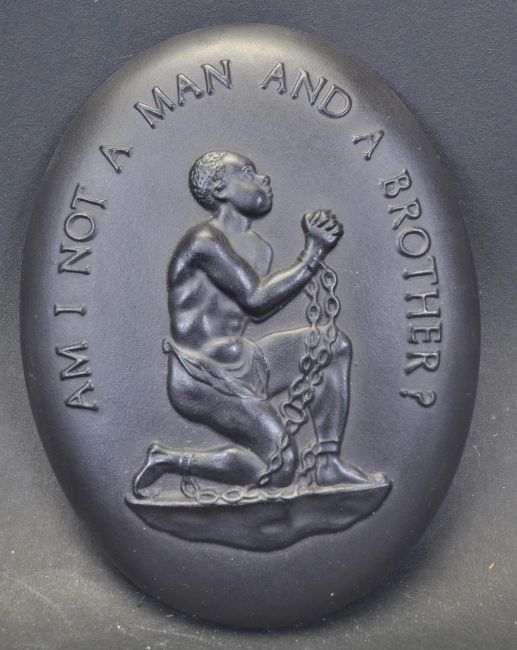 A vintage 20th century Wedgwood Jasperware anti slave / abolitionist black medallion. The legend reads Am I not a man and a brother? Originally made in 1833 to commemorate the Slavery Abolition Act. Produced by the Wedgwood Collectors society. Gold stamp to the back. Measures 10cm x 8cm. Boxed. Good condition.