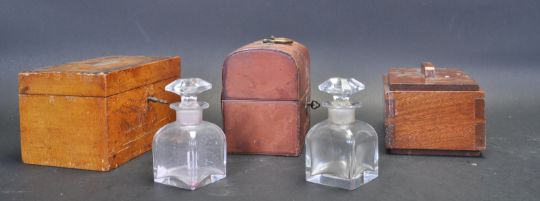 A collection of three vintage 20th century desk top boxes / jewellery boxes. The collection comprising of a dome top box with hinged lid having twin perfume glass bottles, a rectangular jewellery box with mother of pearl inlaid decoration to the hinged lid opening to reveal jewellery compartments along with another rectangular lidded box. Condition: Good used condition, dome top box broken hinge. Measures 9 cm x 16 cm x 9 cm largest.
