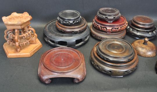 A collection of 20th century Chinese oriental hard wood hand carved stands / ceramic stands. The hand carved stands of a circular form with pierced decoration of various sizes.