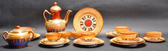 Thousand Faces - A Japanese Meiji period porcelain part coffee service decorated with the Thousand Faces with bands of red, blue and green, with patterned decoration throughout. The set comprising cups with various saucers / side plates, coffee pot, sugar bowl, milk jug etc. All being character marks to the base. Coffee pot measures approx; 20cm x 19cm.
