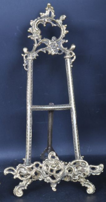 A set of three vintage style graduated picture frame easels with hinged stands and foliate details. Measures 40 cm.