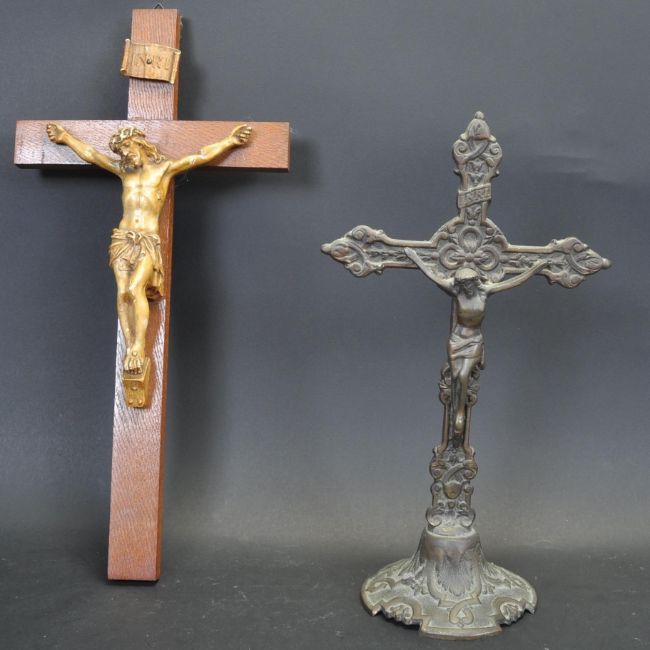 Of Ecclesiastical interest - A vintage 20th century oak crucifix having a resin representation of Jesus. Together with a brass early 20th century crucifix having foliate decoration raised on a circular scalloped base. Measures 42 cm tall.