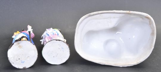 A group of three 19th century ceramic porcelain Staffordshire figurines. The collection comprising of a group lot depicting a couple playing chess raised on a plinth base along with figurine of a 17th century Fox hunter and a lady with a cat. Measures 15 cm tall.