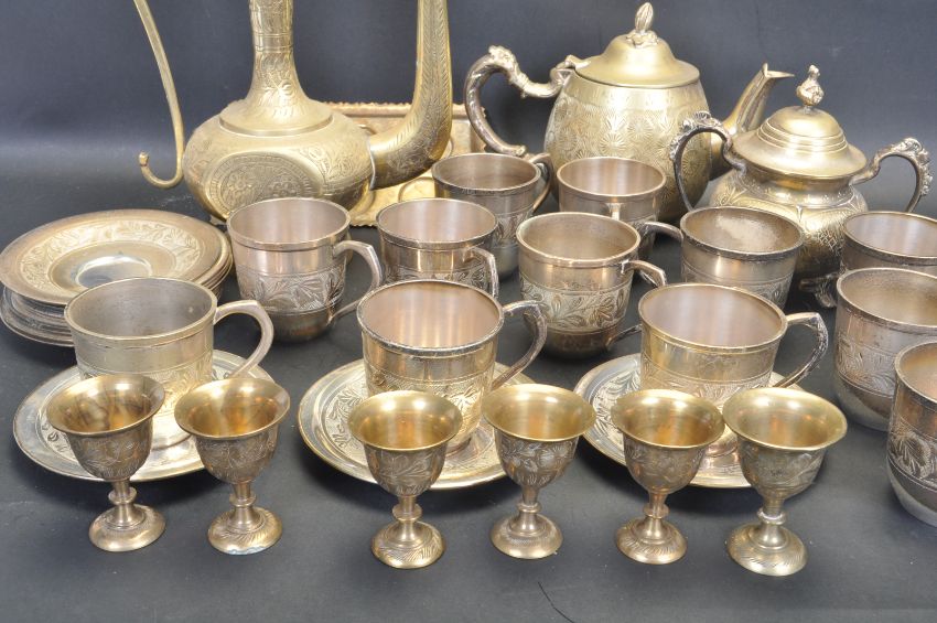 A collection of 20th century Indian brass ware to include teapots, cups, saucers, lidded pot, tray and many more. All being engraved with traditional Indian motifs.