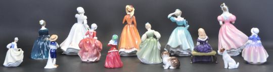 A group of vintage 20th century ceramic porcelain Royal Doulton figurines. The collection comprising of: Rosemary HN 3143, Camellia HN 2222, Julia HN 2705, Celeste HN 2237, Cherie HN 2341, Affection HN 2236, Fair Maiden HN 2211, Dinky Do HN 1678, Christmas Morn HN 3212, Fair Lady HN 3216, Special Friend HN 3607, Goody Two Shoes HN 2087. Tallest measures 20 cm.